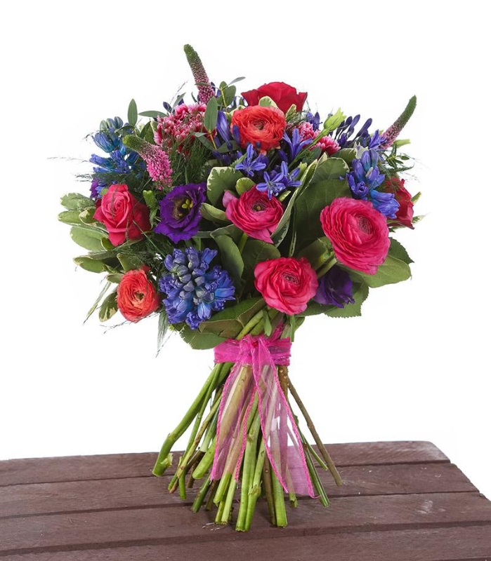 Contrasting deep pinks and blue flowers combined make a beautiful bouquet of flowers.