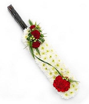 A cricket bat and ball shaped tribute. Red Roses and Carnations with white spray Chrysanthemums with a touch of variegated Dracaena, white Hypericum, black Cordyline and Asparagus Fern.