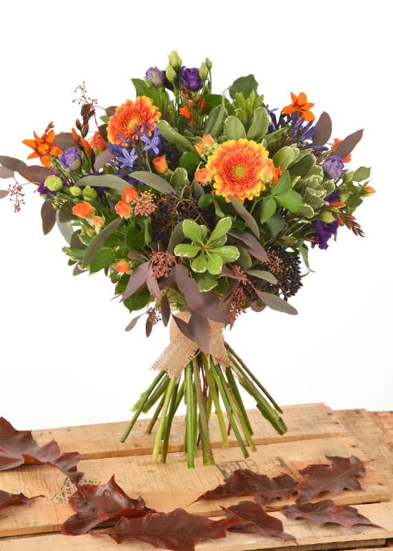 Shades of orange mixed with tones of blue and mauve and green foliage for a very natural hand tied bouquet.