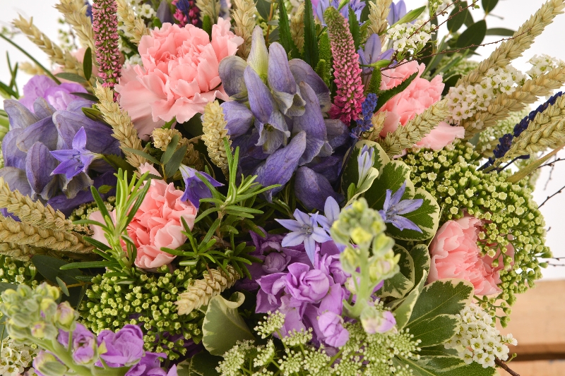 A mixed arrangement of muted summer tones of mauves, blues and pinks complete with rustic jug (jug included).