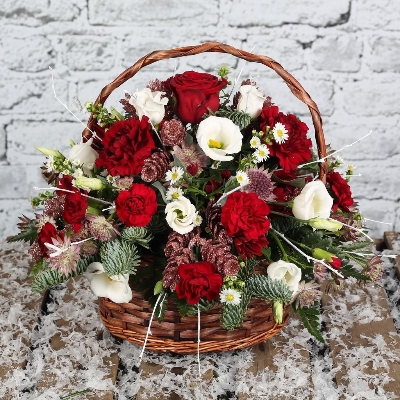 A beautiful basket of red roses, burgundy carnations, white lisianthus, aster September and dusky pink astrantia amongst festive foliage. Finished perfectly with a touch of rose gold glittery cones.