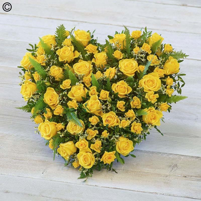 A vibrant heart tribute featuring gorgeous roses, spray roses, and foliage.
